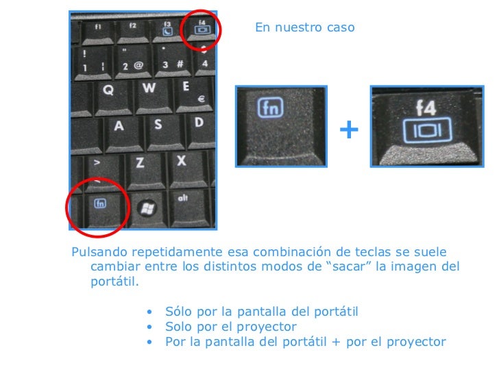 - 10. < ul><li>Pulsando repetidamente esa combinación de teclas se suele cambiar entre los distintos modos de “sacar” la imagen del portátil. </li></ul><ul><ul><ul><ul><li>• Sólo por la pantalla del portátil </li></ul></ul></ul></ul><ul><ul><ul><ul><li>• Solo por el proyector </li></ul></ul></ul></ul><ul><ul><ul><ul><li>• Por la pantalla del portátil + por el proyector </li></ul></ul></ul></ul>En nuestro caso +