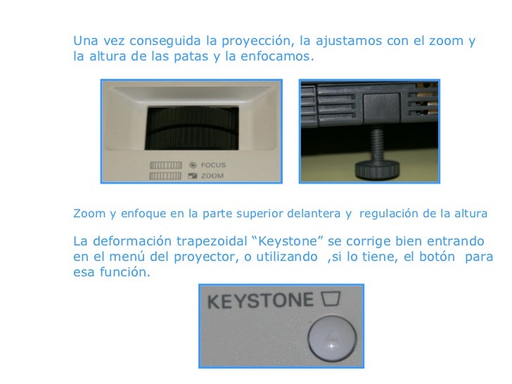 - 11. Una vez conseguida la proyección, la ajustamos con el zoom y la altura de las patas y la enfocamos. Zoom y enfoque en la parte superior delantera y regulación de la altura La deformación trapezoidal “Keystone” se corrige bien entrando en el menú del proyector, o utilizando ,si lo tiene, el botón para esa función.