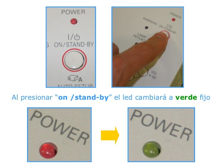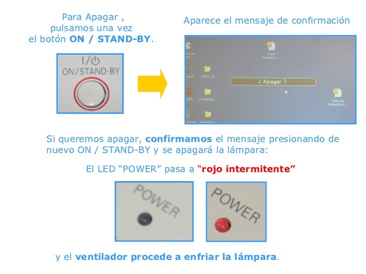 - 12. Para Apagar , pulsamos una vez el botón ON / STAND-BY . Aparece el mensaje de confirmación Si queremos apagar, confirmamos el mensaje presionando de nuevo ON / STAND-BY y se apagará la lámpara: y el ventilador procede a enfriar la lámpara . El LED “POWER” pasa a “ rojo intermitente”