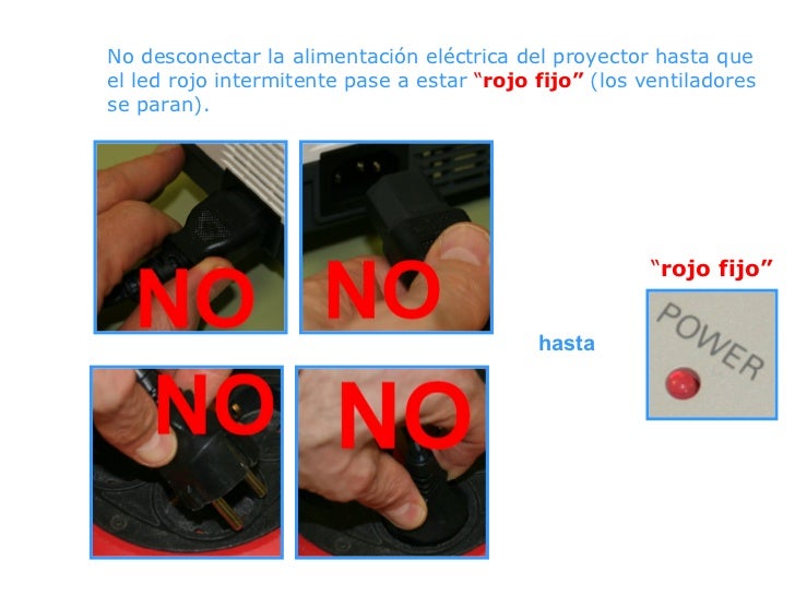 - 13. No desconectar la alimentación eléctrica del proyector hasta que el led rojo intermitente pase a estar “ rojo fijo” (los ventiladores se paran). “ rojo fijo” hasta