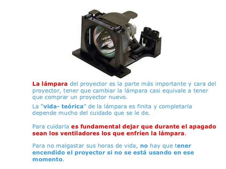 - 14. La “ vida- teórica ” de la lámpara es finita y completarla depende mucho del cuidado que se le de. La lámpara del proyector es la parte más importante y cara del proyector, tener que cambiar la lámpara casi equivale a tener que comprar un proyector nuevo. Para no malgastar sus horas de vida, no hay que t ener encendido el proyector si no se está usando en ese momento . Para cuidarla es fundamental dejar que durante el apagado sean los ventiladores los que enfríen la lámpara .