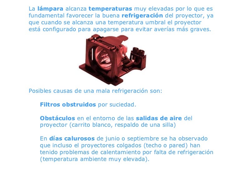 - 15. La lámpara alcanza temperaturas muy elevadas por lo que es fundamental favorecer la buena refrigeración del proyector, ya que cuando se alcanza una temperatura umbral el proyector está configurado para apagarse para evitar averías más graves. <ul><li>Posibles causas de una mala refrigeración son: </li></ul><ul><ul><li>Filtros obstruidos por suciedad. </li></ul></ul><ul><ul><li>Obstáculos en el entorno de las salidas de aire del proyector (carrito blanco, respaldo de una silla) </li></ul></ul><ul><ul><li>En días calurosos de junio o septiembre se ha observado que incluso el proyectores colgados (techo o pared) han tenido problemas de calentamiento por falta de refrigeración (temperatura ambiente muy elevada). </li></ul></ul>