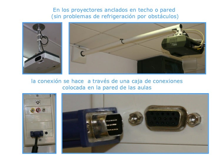 - 16. En los proyectores anclados en techo o pared (sin problemas de refrigeración por obstáculos) la conexión se hace a través de una caja de conexiones colocada en la pared de las aulas