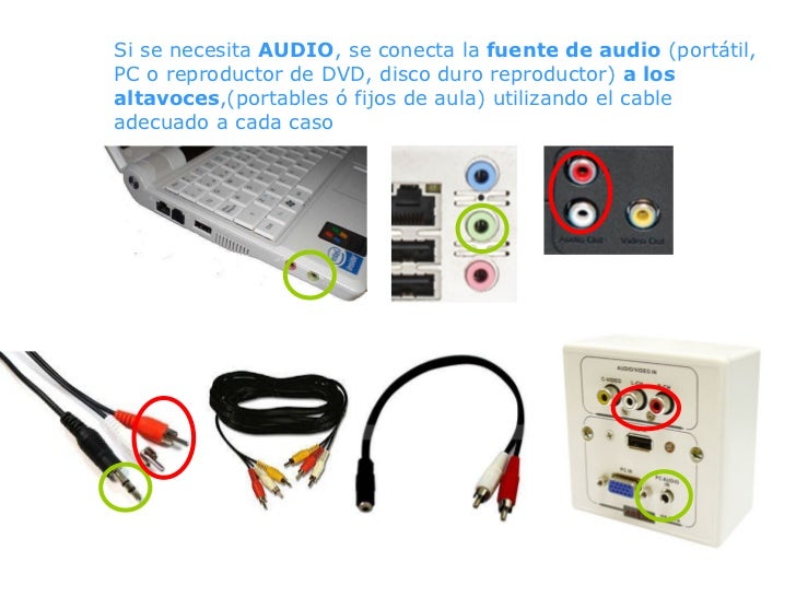 - 19. Si se necesita AUDIO , se conecta la fuente de audio (portátil, PC o reproductor de DVD, disco duro reproductor) a los altavoces ,(portables ó fijos de aula) utilizando el cable adecuado a cada caso