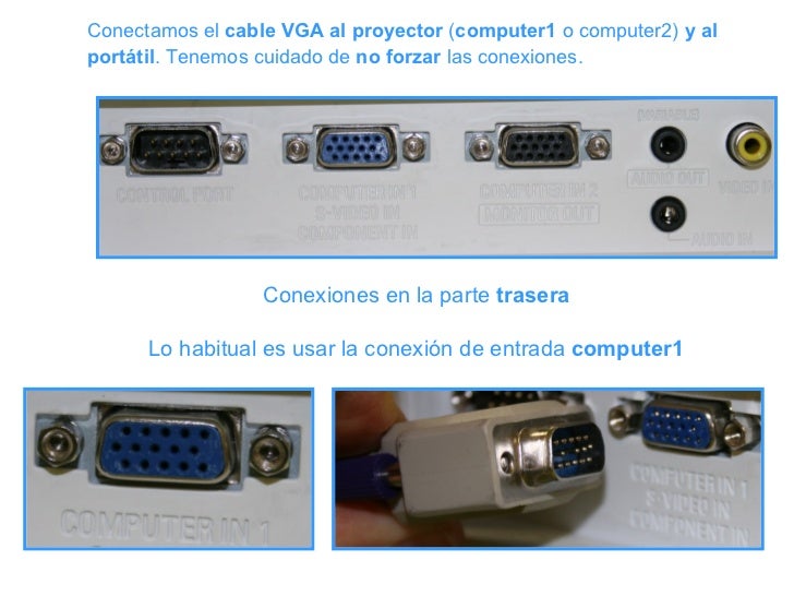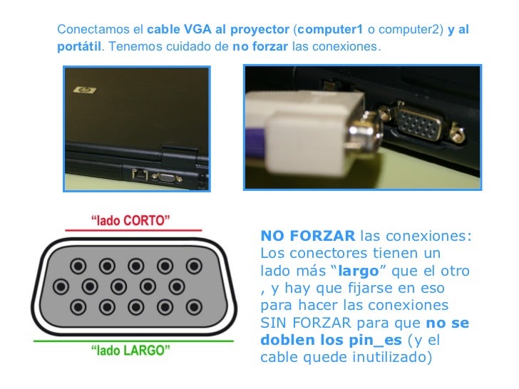 - 4. Conectamos el cable VGA al proyector ( computer1 o computer2) y al portátil . Tenemos cuidado de no forzar las conexiones. NO FORZAR las conexiones: Los conectores tienen un lado más “ largo ” que el otro , y hay que fijarse en eso para hacer las conexiones SIN FORZAR para que no se doblen los pin_es (y el cable quede inutilizado) NO FORZAR las conexiones: Los conectores tienen un lado más “largo” que el otro , y hay que fijarse en eso para hacer las conexiones SIN FORZAR para que no se doblen los pin_es (y el cable quede inutilizado)