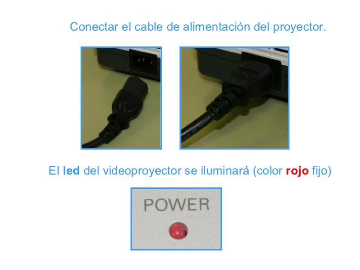 - 5. NO FORZAR las conexiones: Los conectores tienen un lado más “largo” que el otro , y hay que fijarse en eso para hacer las conexiones SIN FORZAR para que no se doblen los pin_es (y el cable quede inutilizado) Conectar el cable de alimentación del proyector. El led del videoproyector se iluminará (color rojo fijo)