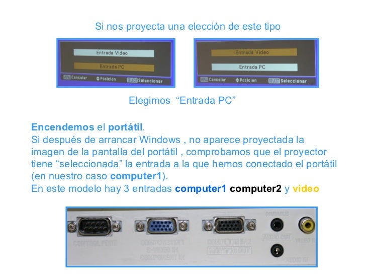 - 7. NO FORZAR las conexiones: Los conectores tienen un lado más “largo” que el otro , y hay que fijarse en eso para hacer las conexiones SIN FORZAR para que no se doblen los pin_es (y el cable quede inutilizado) Si nos proyecta una elección de este tipo Elegimos “Entrada PC” Encendemos el portátil . Si después de arrancar Windows , no aparece proyectada la imagen de la pantalla del portátil , comprobamos que el proyector tiene “seleccionada” la entrada a la que hemos conectado el portátil (en nuestro caso computer1 ). En este modelo hay 3 entradas computer1 computer2 y video