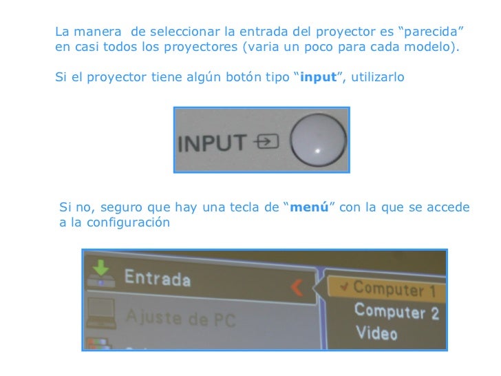 - 8. NO FORZAR las conexiones: Los conectores tienen un lado más “largo” que el otro , y hay que fijarse en eso para hacer las conexiones SIN FORZAR para que no se doblen los pin_es (y el cable quede inutilizado) La manera de seleccionar la entrada del proyector es “parecida” en casi todos los proyectores (varia un poco para cada modelo). Si el proyector tiene algún botón tipo “ input ”, utilizarlo Si no, seguro que hay una tecla de “ menú ” con la que se accede a la configuración