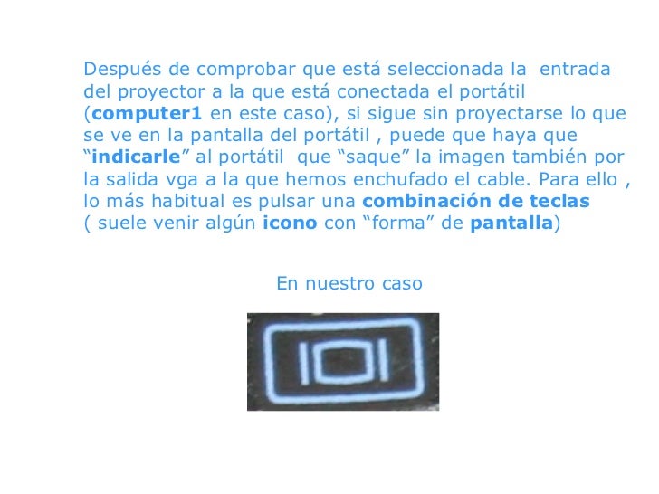 - 9. Después de comprobar que está seleccionada la entrada del proyector a la que está conectada el portátil ( computer1 en este caso), si sigue sin proyectarse lo que se ve en la pantalla del portátil , puede que haya que “ indicarle ” al portátil que “saque” la imagen también por la salida vga a la que hemos enchufado el cable. Para ello , lo más habitual es pulsar una combinación de teclas ( suele venir algún icono con “forma” de pantalla ) En nuestro caso